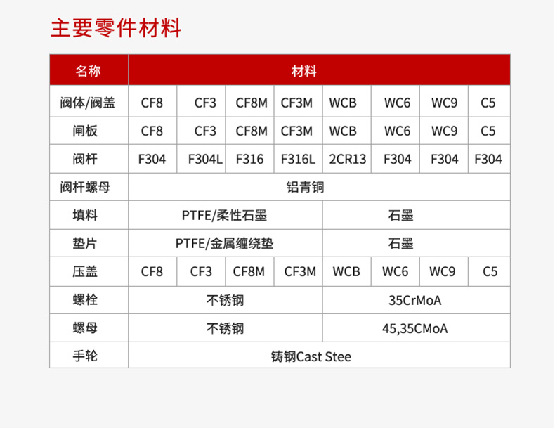 符合国内外先进标准的要求,密封可靠,性能优良,造型美观;闸板、阀座密封面用铁基合金堆埠或司太立(stelite)钴越硬质合金堆焊而成,耐鹿、耐高温、耐腐烛、抗擦伤性能好、使用寿命长;采用煤式弹性间板结构,中大口径设需滚动轴承,开关灵活,启闭轻松阀杆经调质及表面氮化处理,有良好的抗腐蚀性,抗擦伤性和耐磨性;可采用各种配管法兰标准及法兰密封面型式,满足各种工程需要及 用户要求;阀体材料品种齐全,填料、垫片可根据实际工况或用户要求合理选配能适用于各种压力、温度及介质工况