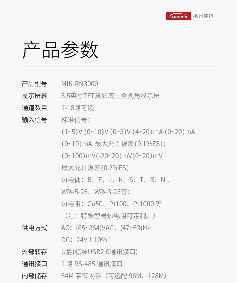 本产品为工业无纸记录仪,配置 3.5 英寸 TFT 真彩全视角液晶显示屏。可以接入多种类型的电流、电压、热电偶和热电阻等工业标准信号,实现温度、湿度、压力、液位、流量的显示、记录、超限监控、报表、数据通讯、信号变送以及流量累积、流量温压补偿等功能。可应用在冶金、石油、化工、建材、造纸、电力、食品、制药、工业水处理等各个行业。