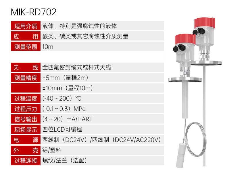 由于采用了先进的微处理器和独特的 Echo Discovery 回波处理技术, 导波雷达物位计可以应用于各种复杂工况。 多种过程连接方式及探测组件的型式,使得 MIK-70系列导波雷达物位计适用于各种复杂工况及应用场合。如:高温、高压及小介电常数介质 等。 采用脉冲工作方式,导波雷达物位计发射功率极低,可安装于各种 金属、非金属容器内,对人体及环境均无伤害